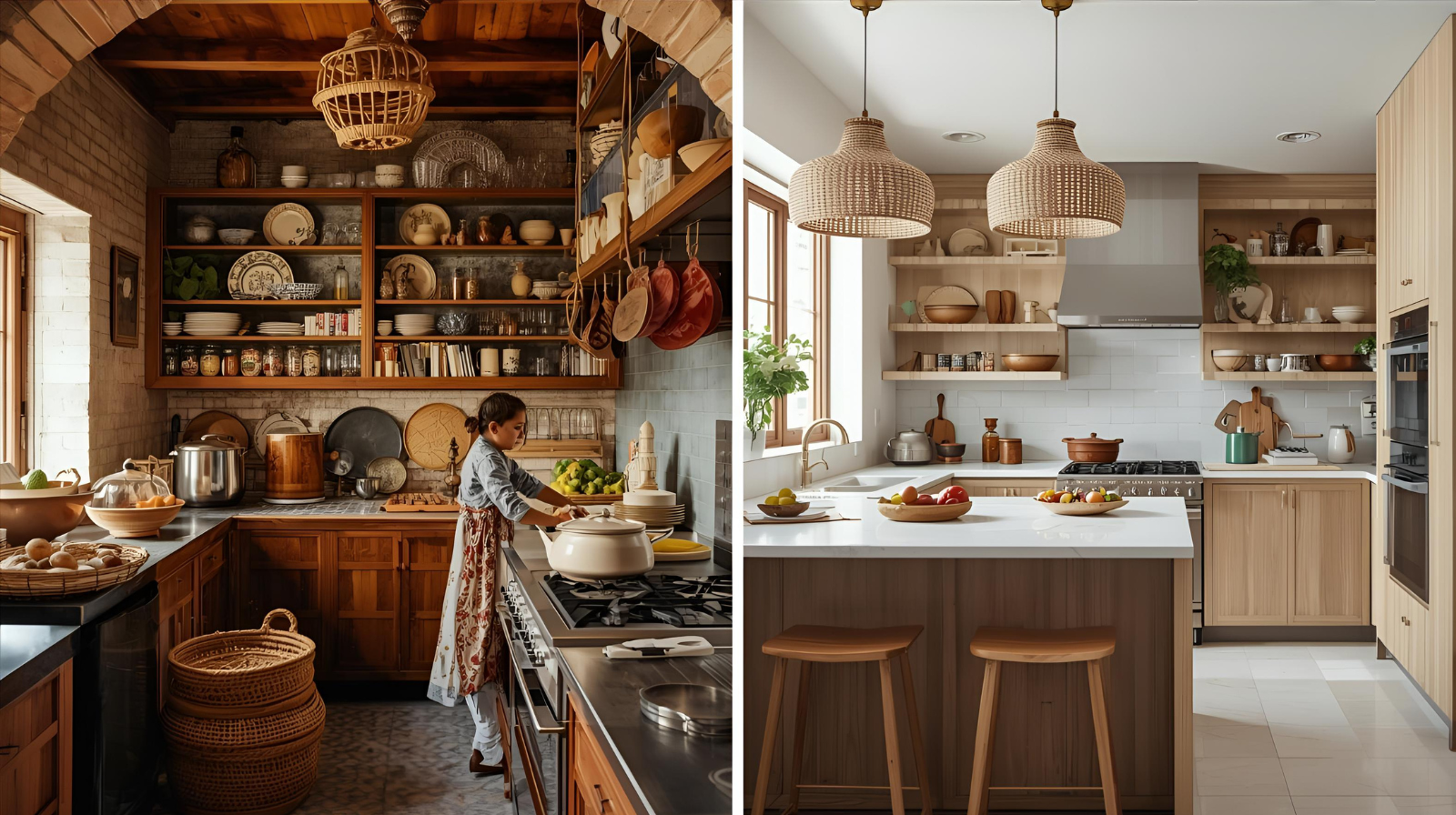 - Modern Kitchens: Stainless steel, non-stick cookware, and advanced appliances dominate modern homes. Pressure cookers, air fryers, and blenders have replaced many traditional tools, offering speed and ease of use.